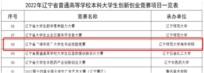 近日,辽宁省教育厅办公室发布了《关于公布2022年辽宁省普通高等学校本科大学生创新创业竞赛项目名单的通知》,我校中文系申报的辽宁省“海华奖”大学生书法技能竞赛成功入选。