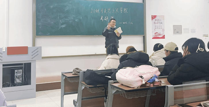 2023年11月30日晚,孙鸿文老师给同学们进行了近两个小时的考研辅导。孙老师一方面给同学们加油鼓劲,告诉同学们考研并没有那么可怕,只要坚定信心,努力学习,最终都可以取得理想的成绩;另一方面,孙老师介绍了历年来马克思主义学院考研的基本概况,并结合自身考研辅导经验、结合马克思主义学院自身的特点,着重给同学们进行了专业课程《马克思主义基本原理》的辅导学习。