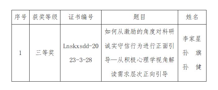 近日,根据《关于2023年学术道德建设优秀征文奖励的决定》(辽社科联发[2023]34号),我校李家星等老师撰写的论文《如何从激励的角度对科研诚实守信行为进行正面引导—从积极心理学视角解读需求层次正向引导》在2023年“学术道德建设”征文活动中荣获优秀成果三等奖。